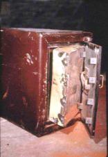 Это пример хорошо выполненной но неудавшейся попытки открыть взрывом книжный сейф. Заряд почти полностью извлек замок, остатки которого можно видеть все еще прикрепленными к задней части дверного полотна.
