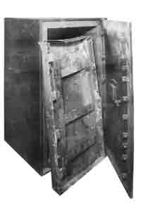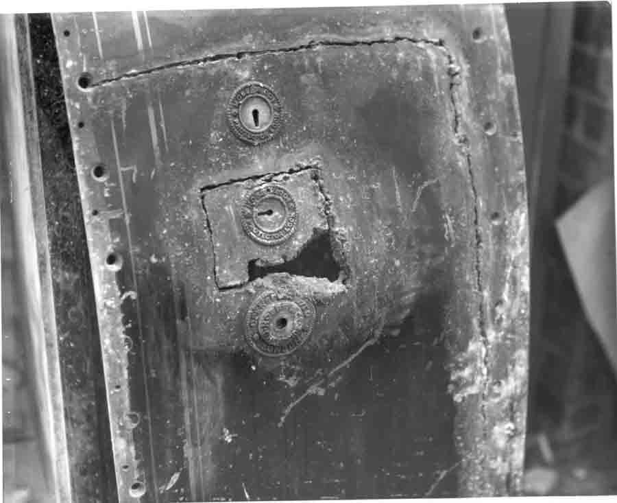 По видимому сейф был ясно виден в ночное время так как располагался между двух стеклянных дверей. Воры однако сумели переместить сейф в подвал где они могли работать спокойно. Сперва они попытались прорезать сейф в нижней части правой двери с помощью кислородно-ацетиленового резака. Из-за отсутствия профессионализма они не могли проникнуть полностью через массив двери образованный двумя ?” стальными плитами склепанными вместе. Затем они попытались вырезать нижний из двух ключевых замков, но по той же причине это им не удалось. .jpg)