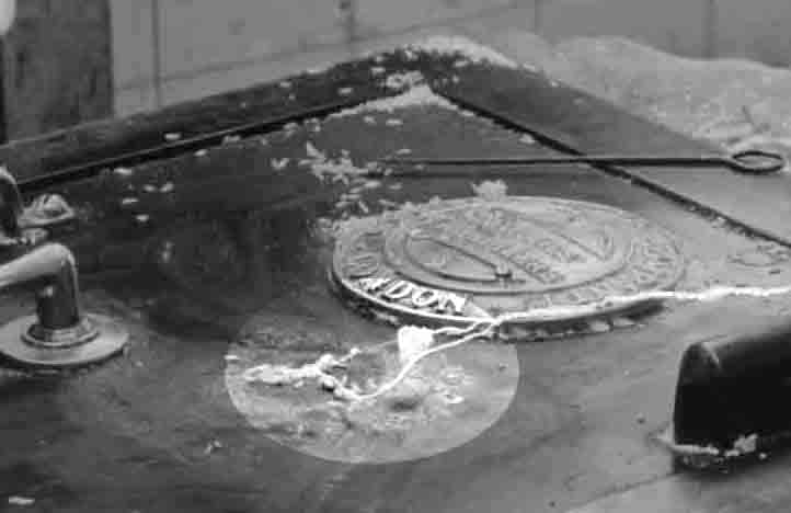 Из-за того что подрывники были побеспокоены они оставили сейф начиненный гелегнитом и детонатором. Крупный план показывает провода детонатора идущие от заряженной ключевой скважины( прикрывающая плита удалена) .Детонатор был аккуратно извлечен,а гелегнит был извлечен при помощи щупа который видно лежащим на дверной пластине. Замок был промыт раствором The carbon tetrachloride пока ключ был вставлен в замок и аккуратно повернут чтобы открыть замок. Затем механизм был разобран и вычищен и возвращен на место.
