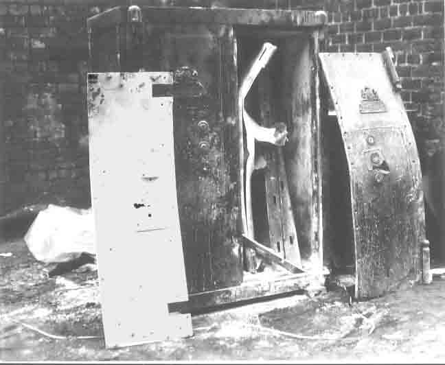 Похоже что сейф был перекинут на заднюю стенку когда сдетонировал заряд и вся сила заряда пришлась на верхнюю часть колпака, в результате чего 16 или около того крепивших колпак болтов сорвало и покореженный колпак остался в дверной раме. Наиболее вероятный исполнитель этого “Шотландец Джимми” который был особенно активным в то время.